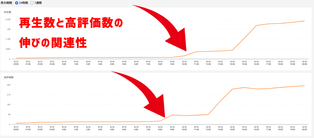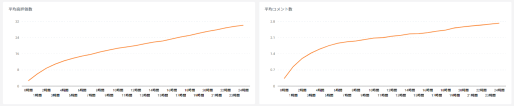 平均高評価数と平均コメント数の推移では、Shortsが投稿されてから24時間の数値の動きを確認できます。時間の経過とともに高評価やコメントがどのように増えていくのかが分かり、Shortsがどのタイミングで視聴者から反応をもらいやすいかを知る参考になります。