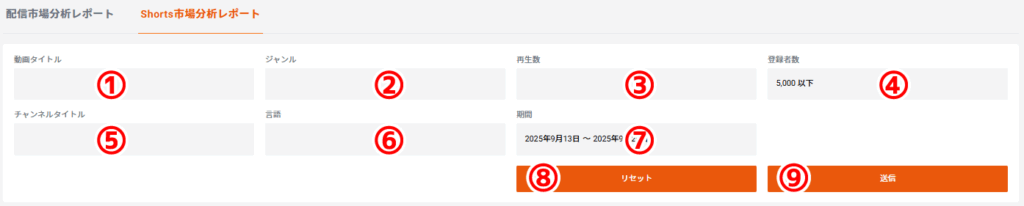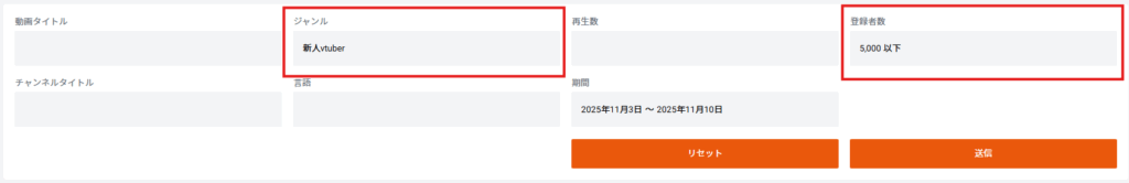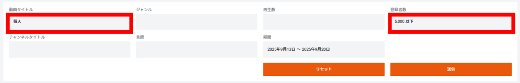 登録者数検索では、Shortsの登録者数を絞り込むことができます。入力した数字の登録者数以下・以上・範囲などで絞り込むことができます。