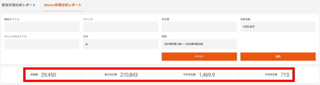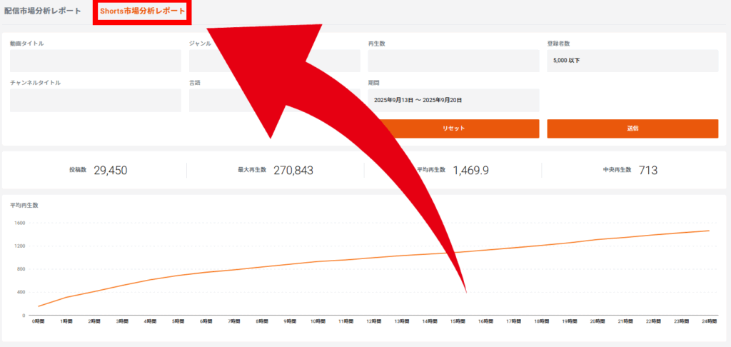 Shorts市場分析レポートでは、投稿から24時間後の再生数が表示されています。再生数の検索も、24時間後の数値を基準にソートされます。