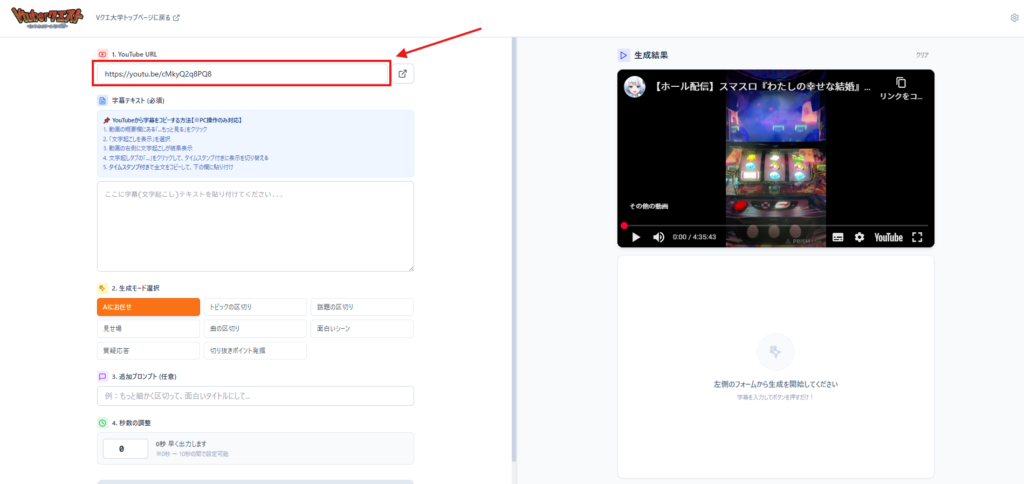 配信が終了した YouTube「ライブ配信」のURLを入力すると、右側にプレイヤーが表示されます。URLボックスの隣ボタンを押すと、入力したURLの YouTube ページに移動できます。