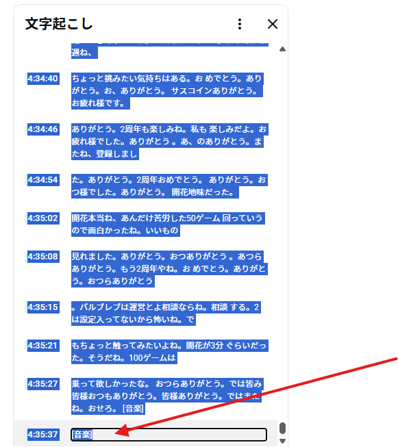 7.スクロールして最後まで表示して、最後の字幕を「Shift」を押しながらクリック。「Ctrl+C」や「右クリック➡コピー」で字幕をコピーする
