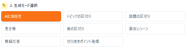 • AIにお任せ:AIが良い感じにタイムスタンプを作ってくれます。