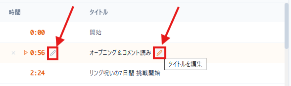 生成結果の秒数の隣にある鉛筆マークをクリックすると、秒数・タイトルを編集できます。秒数・タイトルを直接修正し、Enterキーなどで保存・反映させることができます。