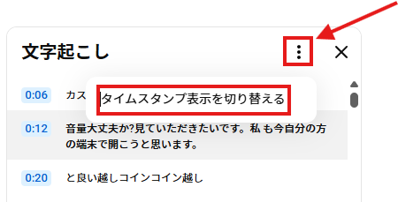 4.文字起しタブの「…」をクリックして、タイムスタンプ付きに表示を切り替える