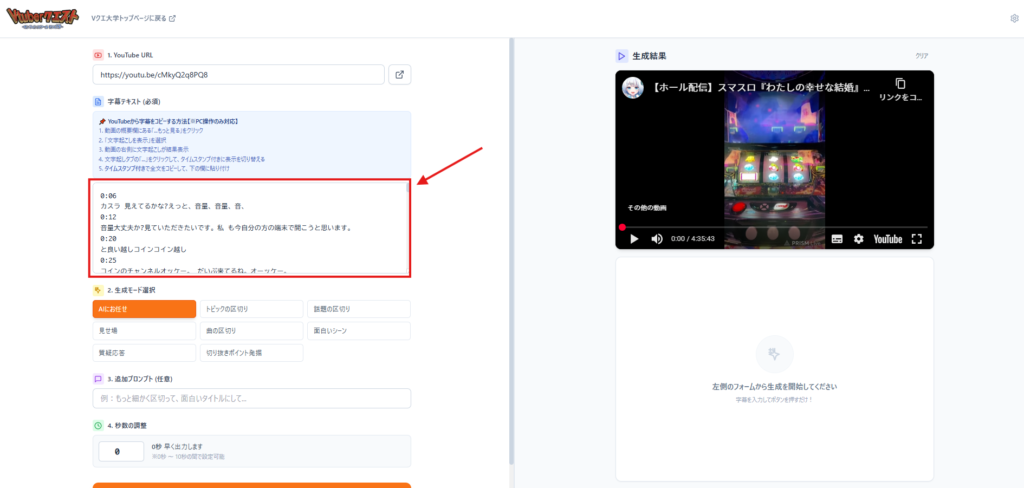 生成結果の秒数の隣にあるバツマークをクリックすると、該当の秒数を削除できます。