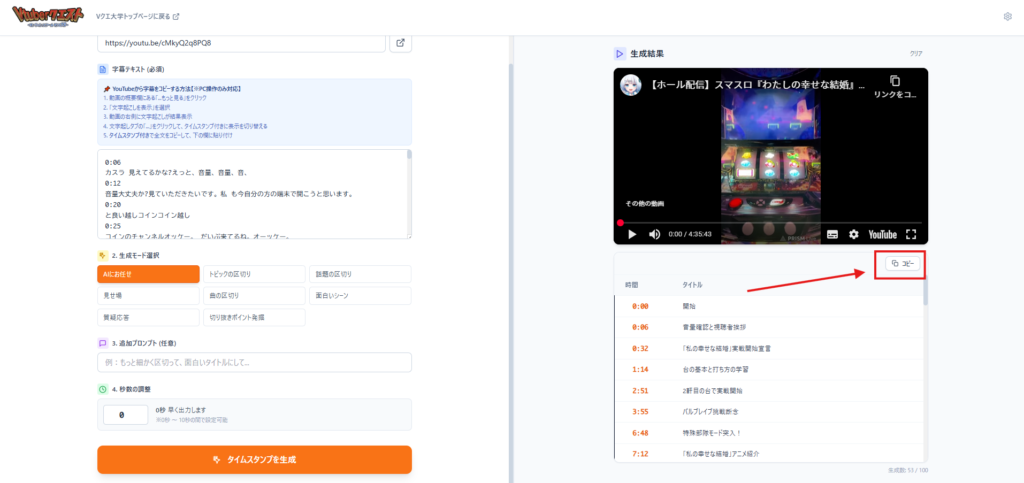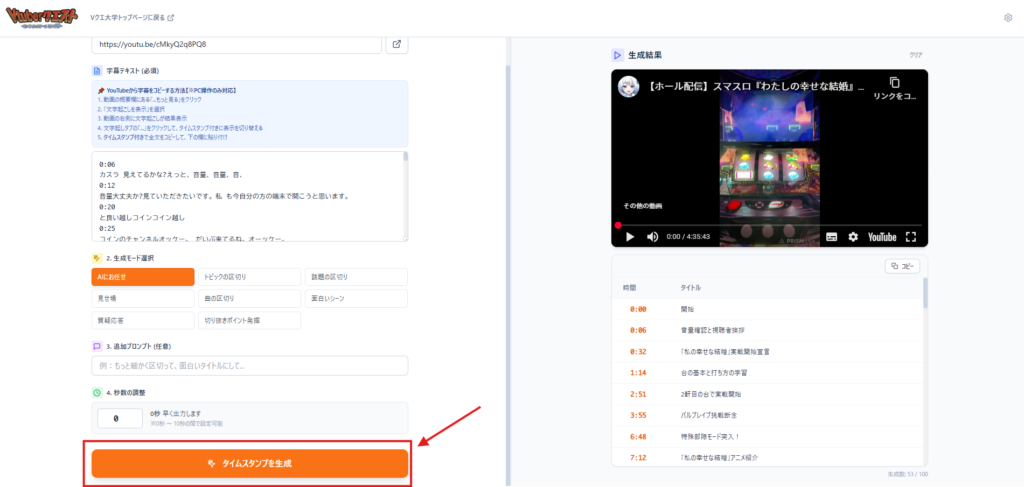 タイムスタンプ自動生成ツールを利用することで、配信の「盛り上がった瞬間」や「曲の切り替わり」「話題転換」などをAIが自動で解析し、タイムスタンプとしてまとめてくれます。
