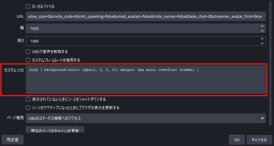 ④ OBSのブラウザソースにカスタムCSSを貼り付ける
