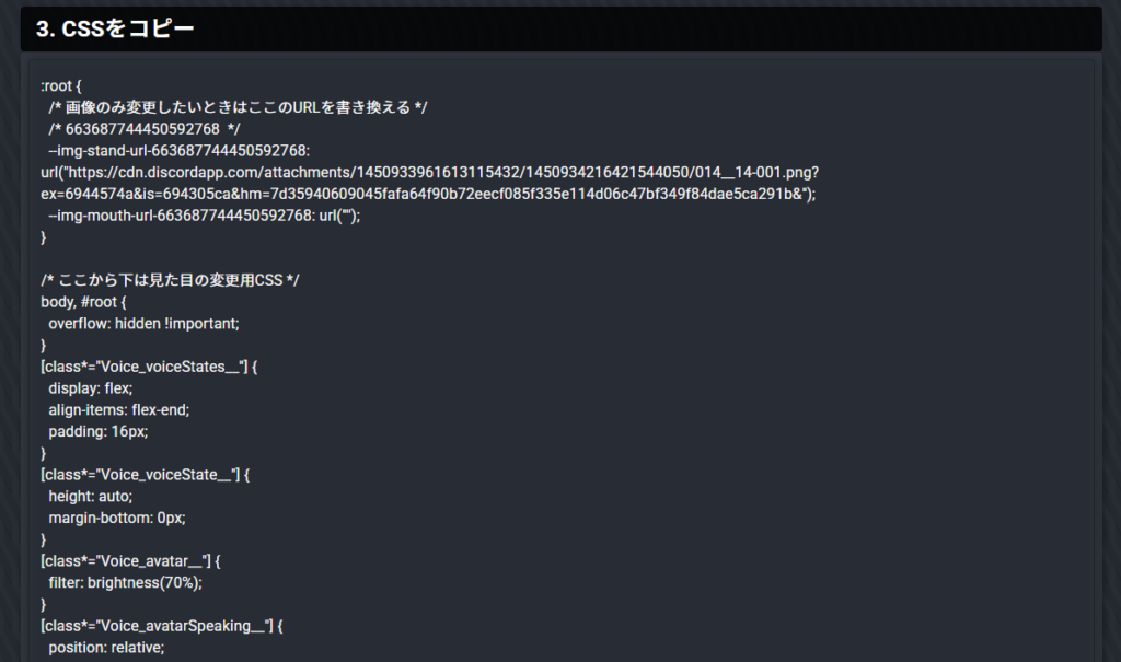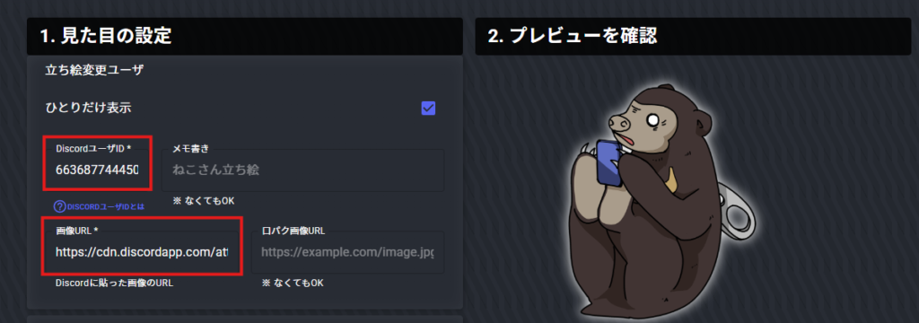 コピーしたURLは、後ほど「立ち絵表示ジェネレーター」の「DiscordユーザーID」欄 に貼り付けます。