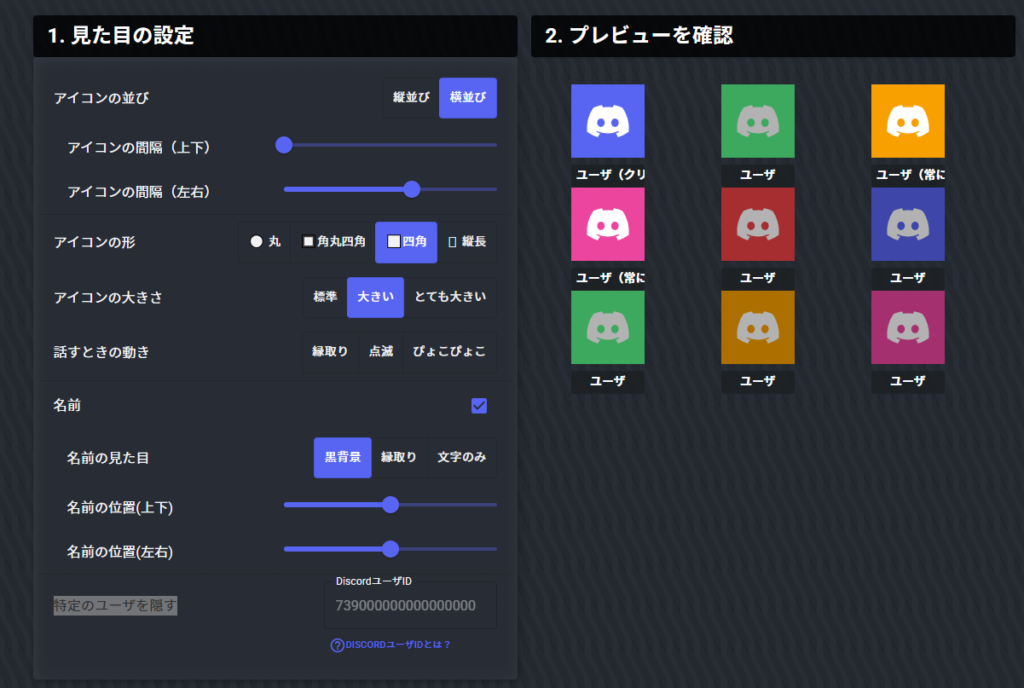 Discord通話中のユーザーに反応して動く、アイコン用のカスタムCSSを自動生成できる無料ツールです。このツールで作成したCSSを、OBSのブラウザソースに貼り付けて使用します。