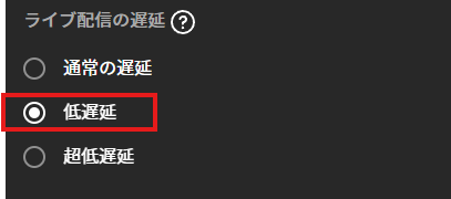 ライブ配信の遅延を「低遅延」にするだけでも、配信が安定することがあります。ただし、この設定では 10~15秒程度のラグ が発生することを覚えておきましょう。